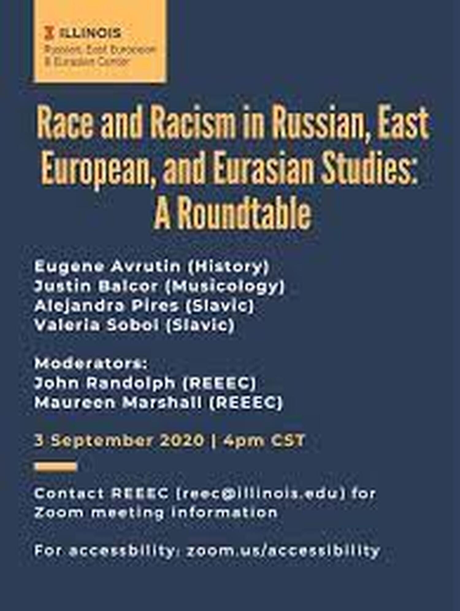 Race and Racism in Russian, East European, and Eurasian Studies: A RoundtableDate: Sep 3, 2020 As a Kickoff Event for this year's New Directions Series, the Russian, East European, and Eurasian Center invites you to join a roundtable discussion on the role of race and racism in our region and scholarly field. |
